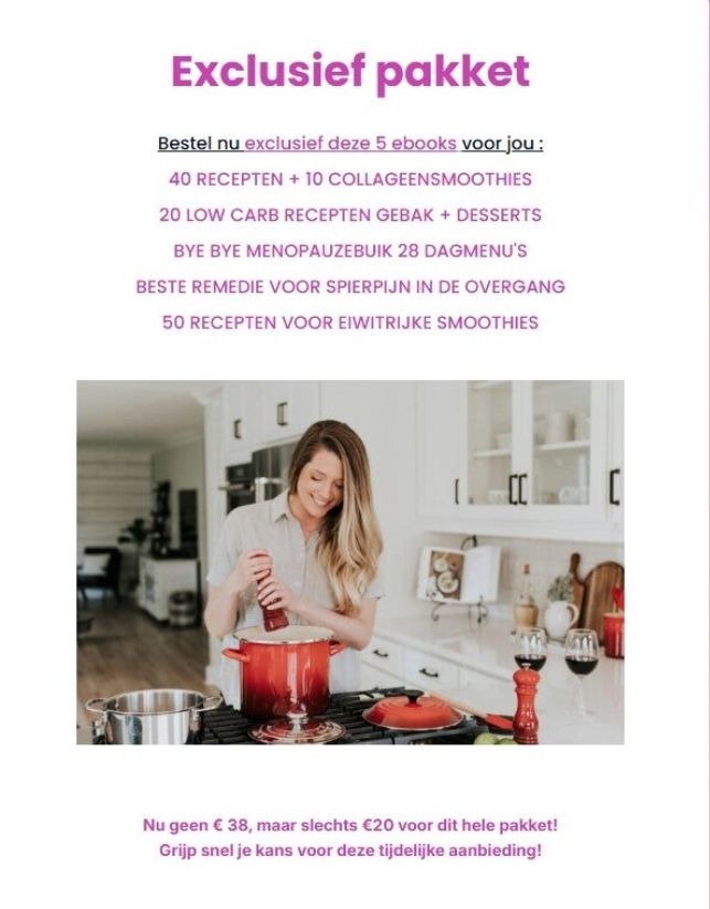 Afvallen gewoon omdat je dat graag wilt of tijdens de overgang? Dat kan – met de juiste kennis en hulp van lekkere recepten die we bieden. Door hormonale veranderingen gaat je stofwisseling trager functioneren, maar met eiwitrijke voeding en collageen smoothies ondersteun je je metabolisme, spiermassa en vetverbranding. We hebben prachtige ebooks hierover.